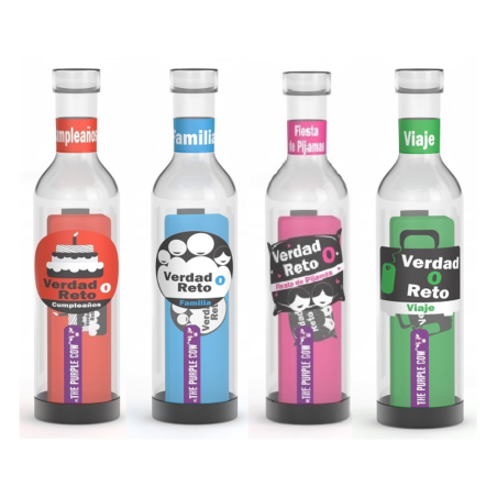 La línea Verdad o Reto de The Purple Cow trae cuatro variantes temáticas: Fiesta de Pijamas, Familia, Viajes y Cumpleaños. Cada edición incluye una botella con 40 cartas que combinan preguntas sinceras y desafíos seguros, pensados para un público desde los 7-12 años en adelante, según la versión.
